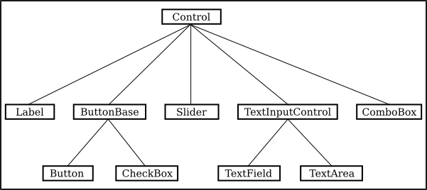 Don't worry about the details for now, but try to get some feel about how object-oriented programming and inheritance are used here. Note that all the GUI classes shown here are subclasses, directly or indirectly, of a class called Control, which represents general properties that are shared by many JavaFX components. In the diagram, two of the direct subclasses of Control themselves have subclasses. The classes TextField and TextArea, which have certain behaviors in common, are grouped together as subclasses of TextInputControl. Similarly Button and CheckBox are subclasses of ButtonBase, which represents properties common to both buttons and checkboxes. (ComboBox, by the way, is the class that represents pop-up menus.)